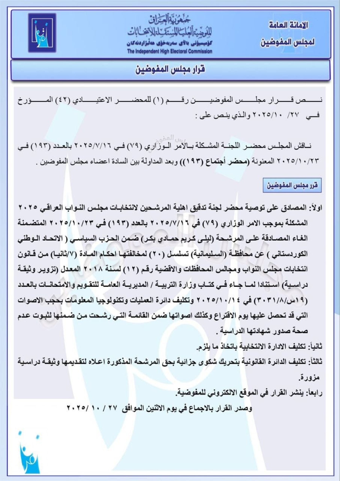 ـ پەسەندکردنی بڕیاری دورخستنەوەی كاندید، لەیلا کەریم حەمادی بەکر لەسەر لیستی یەکێتیی نیشتمانیی کوردستان، لەشاری سلێمانی بەهۆی ساختەکردنی بڕوانامەی خوێندنەوە.