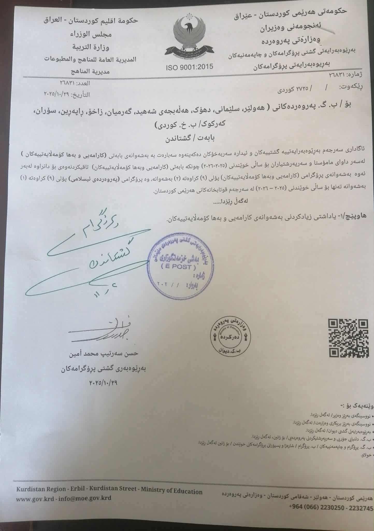 بهگوێرهى ساڵنامهى نوێى خوێندنى 2025 ـ 2026، هەفتانە دوو وانەی پەروەردەی ئیسلامی دەخوێندرا، بەڵام بەهۆی زیادکردنی وانەی کارامەییو بەها کۆمەڵایەکان بۆ هەر هەفتەیەک دوو وانە، بڕیاردرا بەشە وانەی پەروەردەی ئیسلامی كهمبكرێتهوه بۆ یهك بهشه.