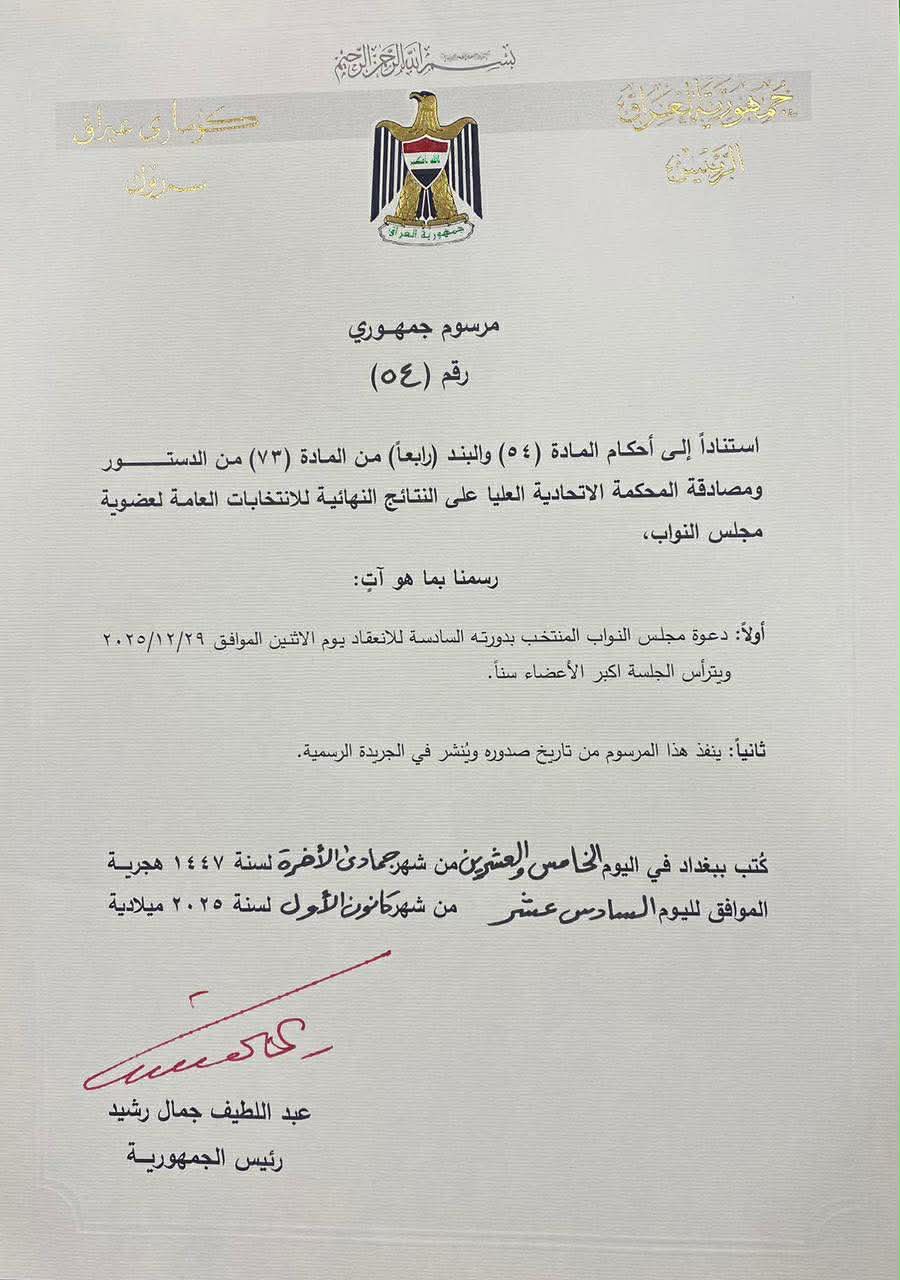 لهنوسراوهكهدا كه واژى سهرۆك كۆمارى لهسهره، تێیدا داوای لەپەرلەمانی نوێ کردوه ڕۆژی دوشەممە 29ی کانونی دوەمی 2025، یەکەم دانیشتنی سازبکاتو بەتەمەنترین ئەندامیش سەرۆکایەتیی دانیشتنەکە بکات.