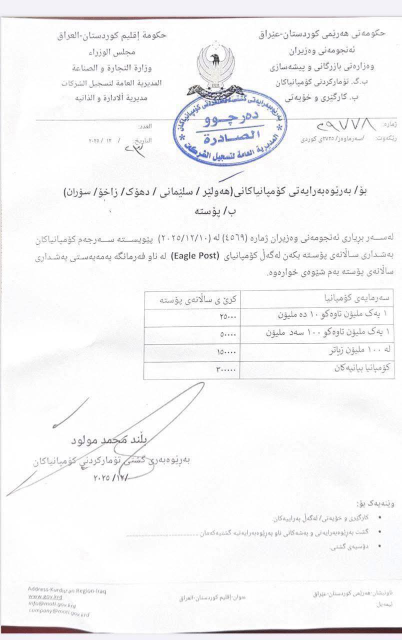 وەزارەتی بازرگانیی حکومەتی هەرێم لەنوسراوێکیدا کە ئاراستەی بەڕێوەبەرایەتی کۆمپانیاکانی کردوە ئاماژەی بەوەکردوە، پێویستە سەرجەم کۆمپانیاکان باجێکی ساڵانە بدەنە کۆمپانیای ئیگەڵ پۆست کە کۆمپانیای بەرپرسێکی حزبییەو خۆیشی وەک کۆمپانیایەکی کەرتی تایبەت مامەڵەی لەگەڵ دەکرێت.
