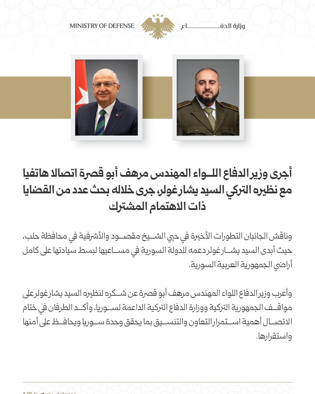 بهگوێرهى ڕاگهیهنراوێكى وهزارهتى بهرگریى سوریا، ئێوارهى ئهمڕۆ مهرهەف ئەبو قەسرە وەزیری بەرگریی سوریا پەیوەندییەکی تەلەفۆنی لەگەڵ هاوتا تورکەکەی یاشار گولەر ئەنجامداو تێیدا چهند بابهتێكى هاوبەشی ههردوو وڵاتهكهیان تاووتوێكردوه.