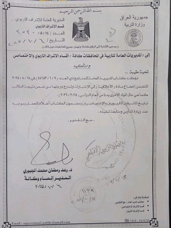پەروەردەی عێراق لەنوسراوێكدا ئاشكرایكرد، بابەتێکی نوێ بۆ ساڵی خوێندن زیاددەكەن کە پەیوەستە بەهەڵسوکەوت و ڕەوشت و ئاکارو ڕاشیگەیاند، هاوشێوەی بابەتەکانی تر دەبێتە بەشێک لە تاقیکردنەوەکانی قوتابیان و خوێندکاران.