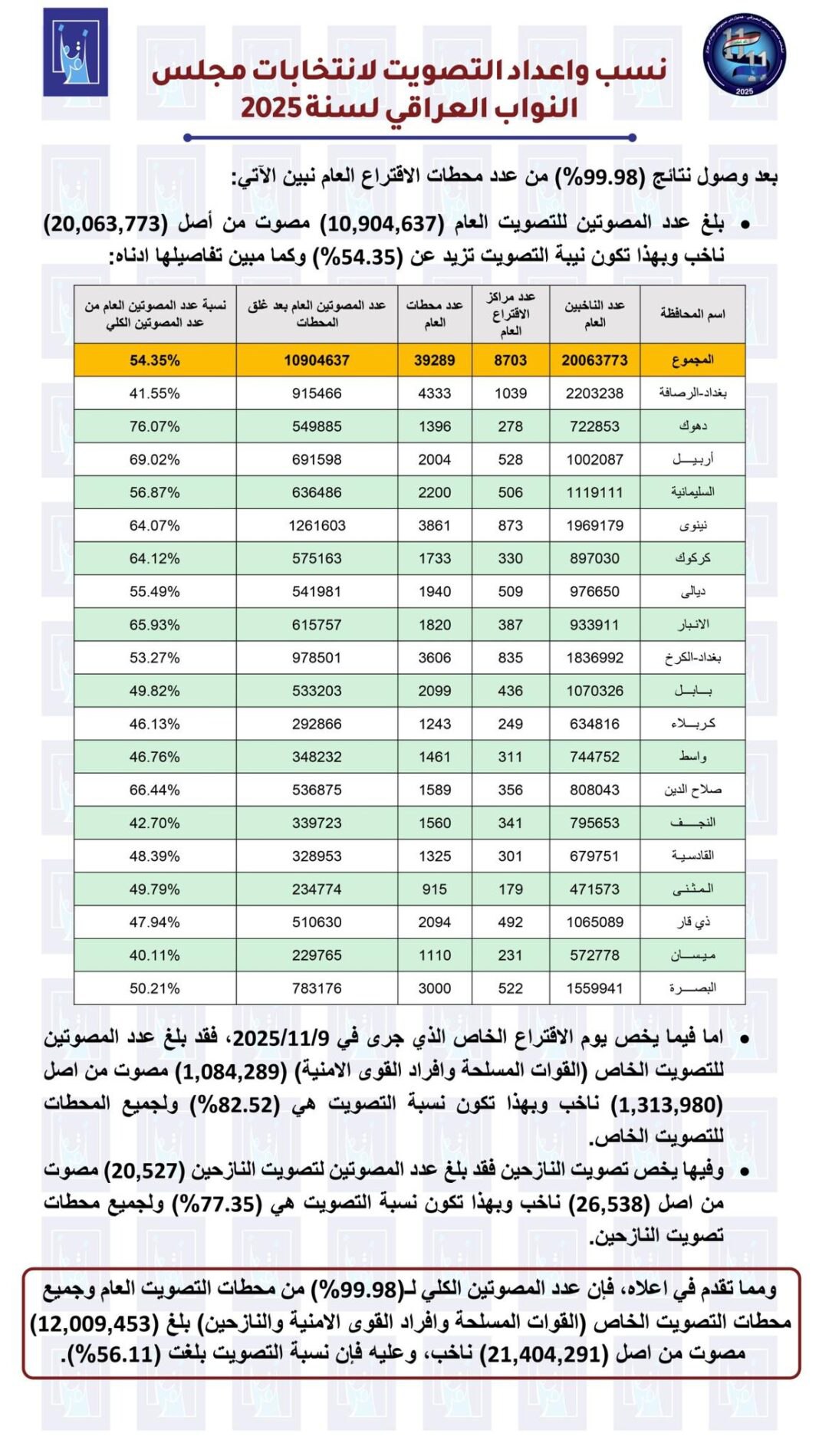 کۆمسیۆنی باڵای سەربەخۆی هەڵبژاردنەکانی عێراق بەفەرمی ژمارەی دەنگ و ڕێژەی بەشداریکردنی گشتی و پارێزگاکانی لەهەڵبژاردنە پەرلەمانییەکە ڕاگەیاند، کەبەگشتی لەسەرجەم پارێزگاكاندا لە 56٪ی تێپەڕاندوە.
