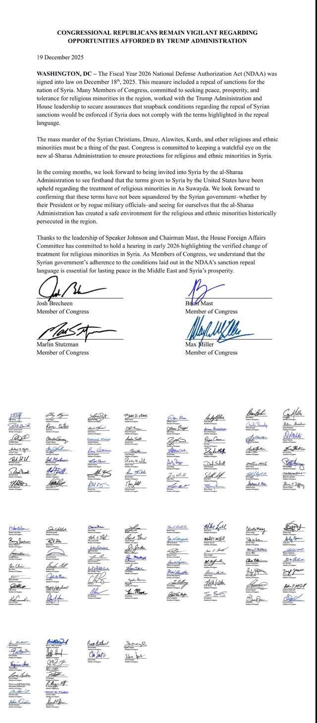 ئهو بهڵگهنامهیه كه مێژوهكهى بۆ 19ى 12ى 2025 دهگهڕێتهوه، ئهو 72 كۆنگرێسمانهى ئهمریكا نوسیویانه، "ههڵگرتنى سزاكانى ئهمریكا لهسهر سوریا، بەندە بەڕێزگرتنو کارکردن لەگەڵ پێکهاتەکانی سوریا وەک (کریستیان، عەلەوی، دروزو کورد)و دابینکردنی مافەکانیان".