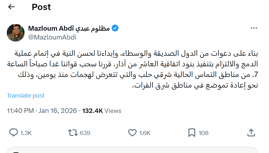 مەزڵوم عەبدی، فەرماندەی گشتیی هێزەکانی سوریای دیموکرات ڕایگەیاند،" لەهەنگاوێکی ستراتیژیدا بۆ هێورکردنەوەی گرژییەکان و وەک وەڵامێک بۆ دەستپێشخەریی وڵاتانی دۆست، بڕیاری پاشەکشەکردنی هێزە سەربازییەکانمان بۆ ڕۆژهەلاتی فوراتدا".