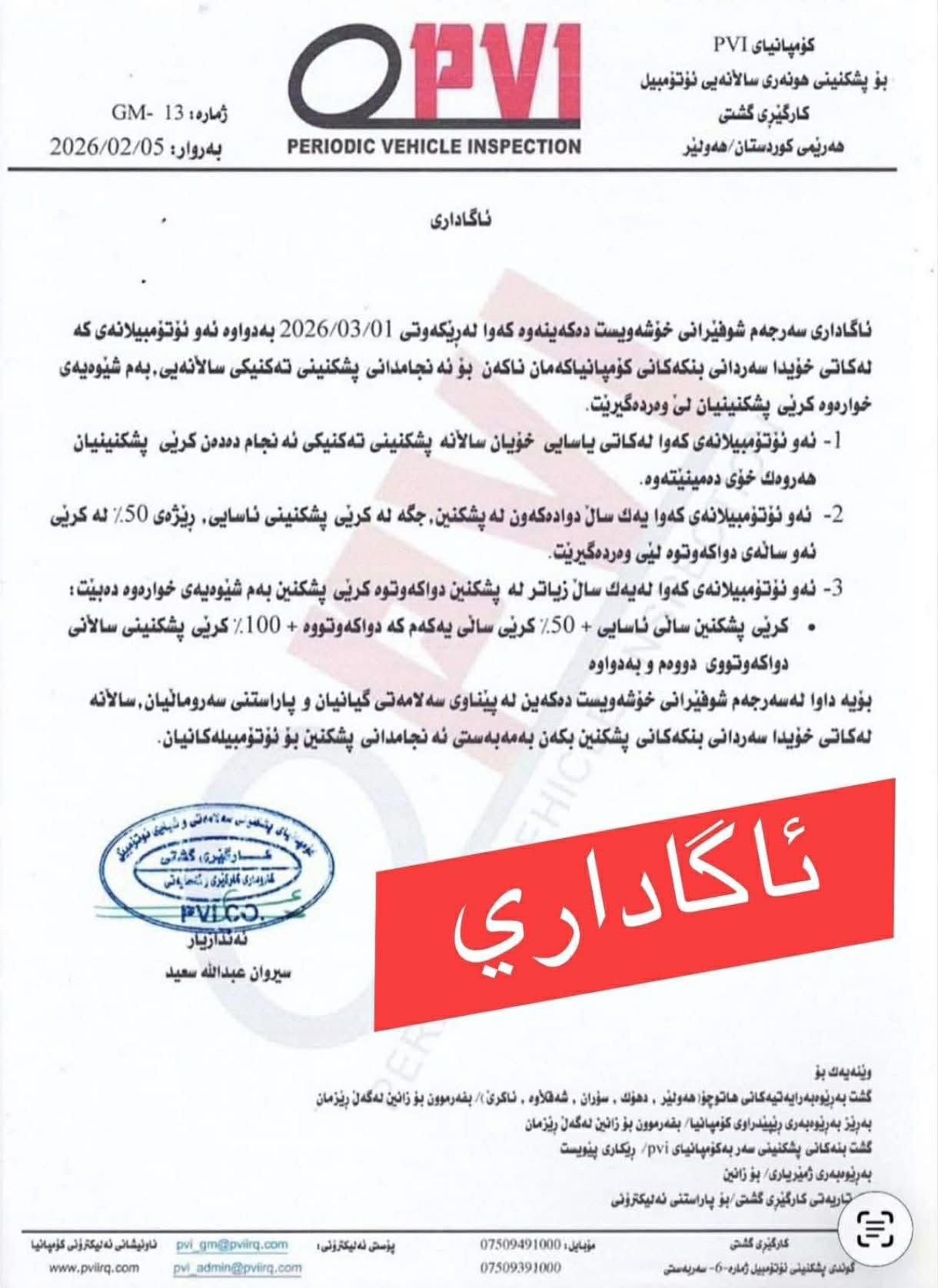 کۆمپانیای PVI بۆ پشکنینی تەکنیکی ئۆتۆمبێل لەهەرێم، بڕیارێکی نوێی سەبارەت بەکرێو سزای دواکەوتنی پشکنینی ساڵانە دەرکرد، بڕیارەکە لەڕۆژى 1ی ئاداری 2026 دەچێتە بواری جێبەجێکردنەوەو تێیدا سزای دارایی توند بۆ ئەو ئۆتۆمبێلانە دیاریکراوە کە لەکاتی خۆیاندا پشکنینی توندوتۆڵیی ئوتۆمبێل ئەنجامنادەن.
