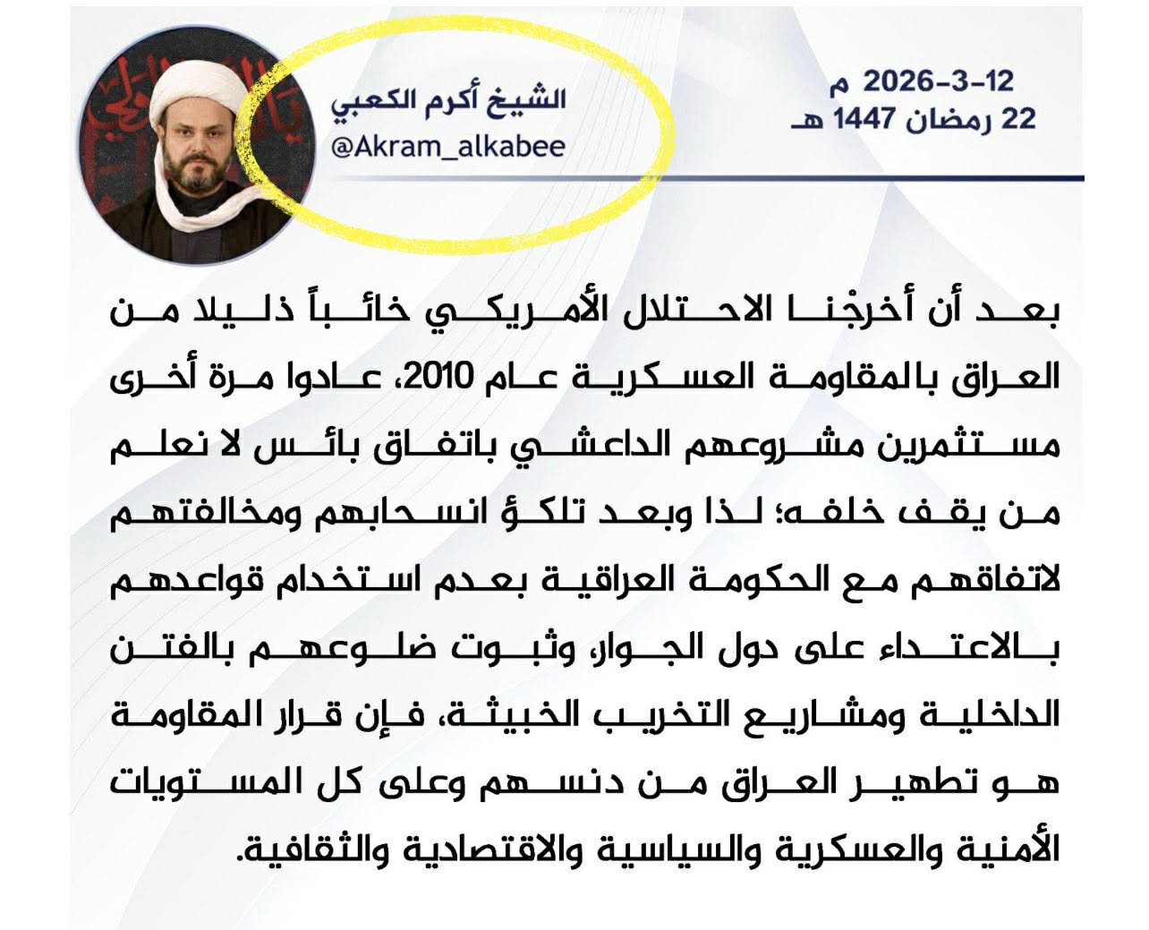 ئهكرهم کەعبی لهپهیامێكدا دهڵێت، "ئێمه پێشتریش لەساڵی 2010دا بەفشاری سەربازییو بەسەرشۆڕیهوه هێزە بیانییەکانمان لەعێراق وەدەرناوە، بەڵام ئێستا ئەو هێزانە لەژێر پەردەی ڕێککەوتنی سیاسیی بێ ئومێدکەر گەڕاونەتەوە، ئەوهشى كراوه، تەنها بۆ تێکدانی سەقامگیریی وڵاتە".