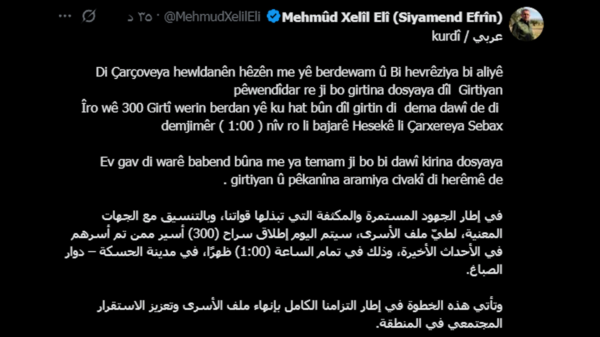 ههر لهم ساتهوهختهوه كهسوكارى ئهو گیراوانهى بڕیاره ئهمڕۆ ئازادبكرێنو بگهڕێندرێنهوه حهسهكه، لەشوێنی دیاریكراو كۆبونهتهوه، چاوی دایکانێک دەبینرێت کە ساڵانێکە لەڕێگەی هاتنەوەی ڕۆڵەکانیان بڕاوە، ئەم ئازادکردنە کە بەهەماهەنگی لەگەڵ لایەنە پەیوەندیدارەکان ئەنجامدەدرێت، بەشێکە لەڕێککەوتنێکی گەورەتر بۆ چۆڵكردنى زیندانەکانو ئاساییکردنەوەی بارودۆخی ناوچەکە لهنێوان هێزهكانى سوریاى دیموكرات (ههسهده)و حكومهتى دیمهشق.