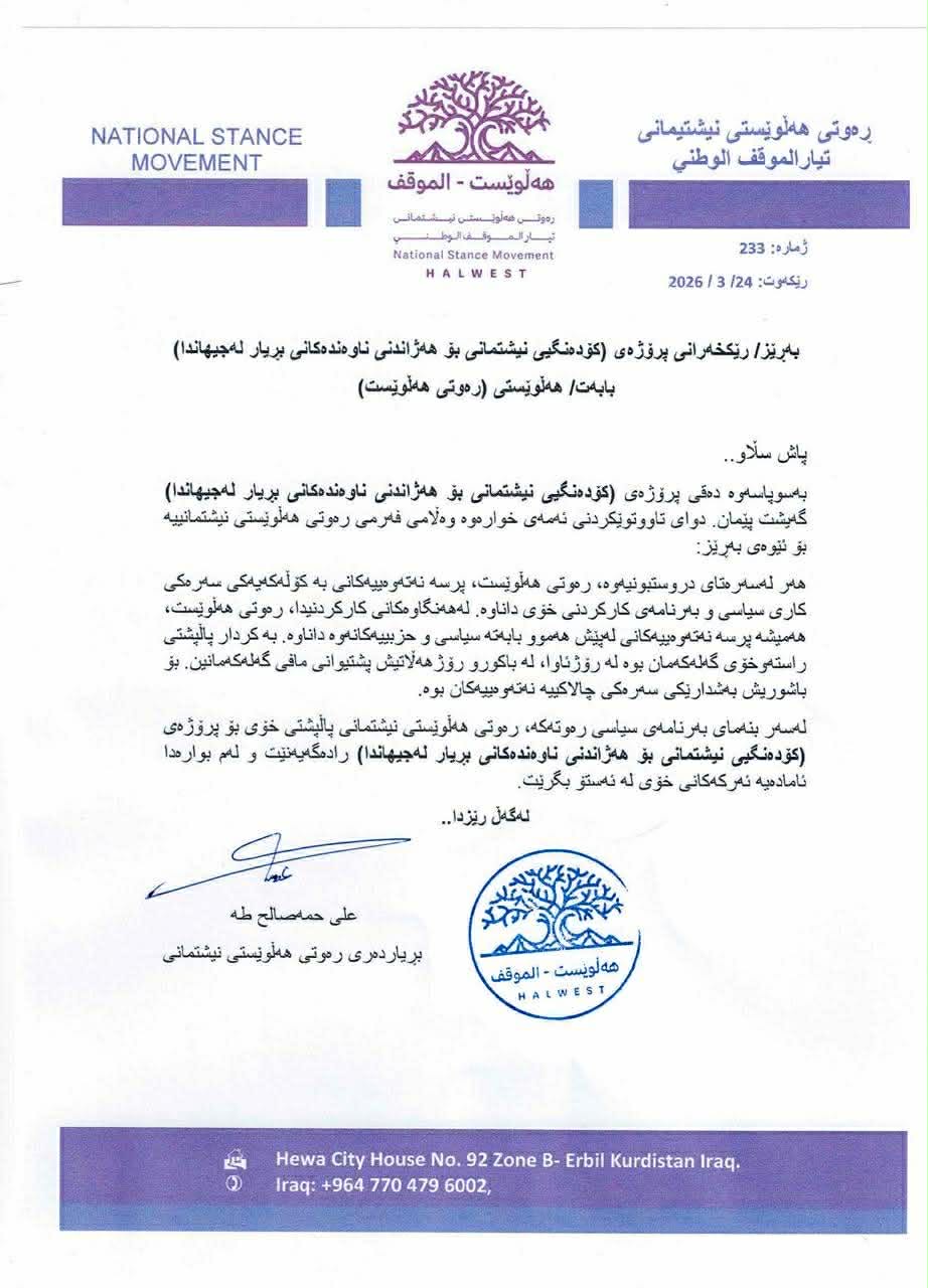 عەلی حەمە ساڵح بڕیاردەری ڕەوتی هەڵوێستی نیشتمانیی لەپەیامێکی فەرمیدا بۆ ڕێکخەرانی پڕۆژەکە، وێڕای دەستخۆشی، ئاماژەی بەوەکردوە، پرسی نەتەوەیی کۆڵەکەی سەرەکی کارکردنی ئەوانە، ئامادەشن هەموو ئەو ئەرکانە بگرنە ئەستۆ کە پڕۆژەکە بۆ داکۆکیکردن لەمافەکانی گەلی کورد لەناوەندە نێودەوڵەتییەکاندا دەیخاتەڕوو.