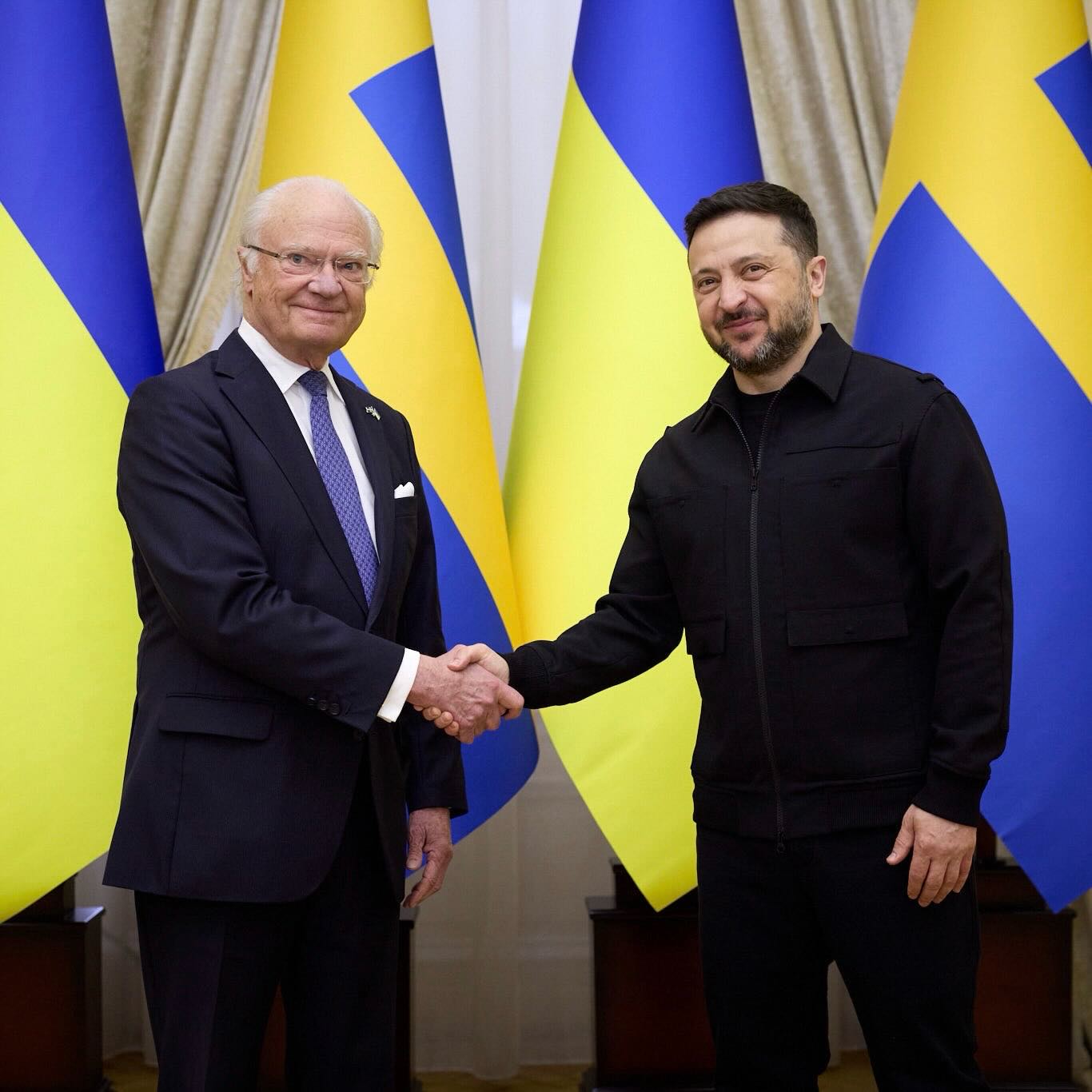 سەرۆکی ئۆکرانیا کە بەشێوازە گەرمو جەماوەرییەکەی ناسراوە، ویستی بەباوەشێکی کراوە پێشوازیی لەپاشا بکات، بەڵام پاشای سوید بەوپەڕی ساردیو بەپشتبەستن بەپرۆتۆکۆڵە مێژوییەکانی بنەماڵەی (بێرنادۆت)، مەودایەکی فەرمی پاراستو ڕەتیکردەوە بچێتە ناو باوەشی سەرۆکی ئۆکرانیا یان تەنانەت تەوقەیەکی ئاساییش بکات.