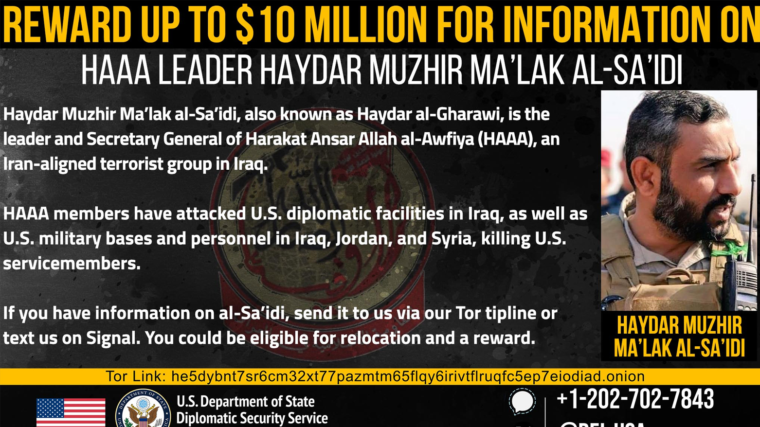 وەزارەتی دەرەوەی ئەمریکا لەرێگەی پڕۆگرامی "پاداشت بۆ دادپەروەری" (Rewards for Justice)، بڕی 10 ملیۆن دۆلاری وەک خەڵات تەرخان دەكات بۆ هەر کەسێک زانیاریی لەسەر شوێن یان چالاکییەکانی "حەیدەر موزهر مەلەک سەعیدی" بدات كە فەرماندەی گروپێکی چەکداری نزیک لەئێرانەو لەعێراق نیشتەجێیە.