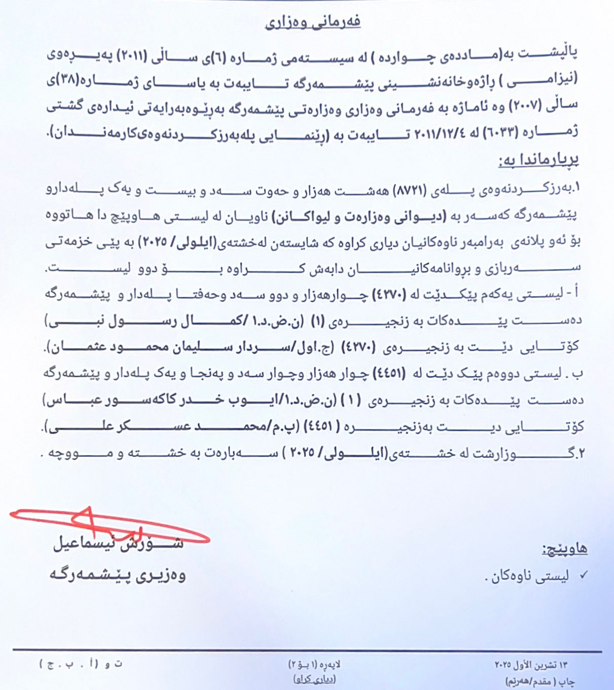 بهگوێرهى نوسراوێكى پیرۆزبایى شۆڕش ئیسماعیل وەزیری پێشمەرگەى حكومهتى ههرێم كه ئاراستهى کارمەندانو پلەدارانی وەزارەتی پێشمەرگەى كردوه، نوسیویهتى، "بەبۆنەی پلە بەرزکردنەوەیان، پیرۆزبایی لەههشت ههزارو 721 پێشمەرگەو پلەداری وەزارەتی پێشمەرگە دهكهم کە لەخشتەی ئەیلولی ساڵی 2025 پلەکانیان بەرزکراوهتهوه".