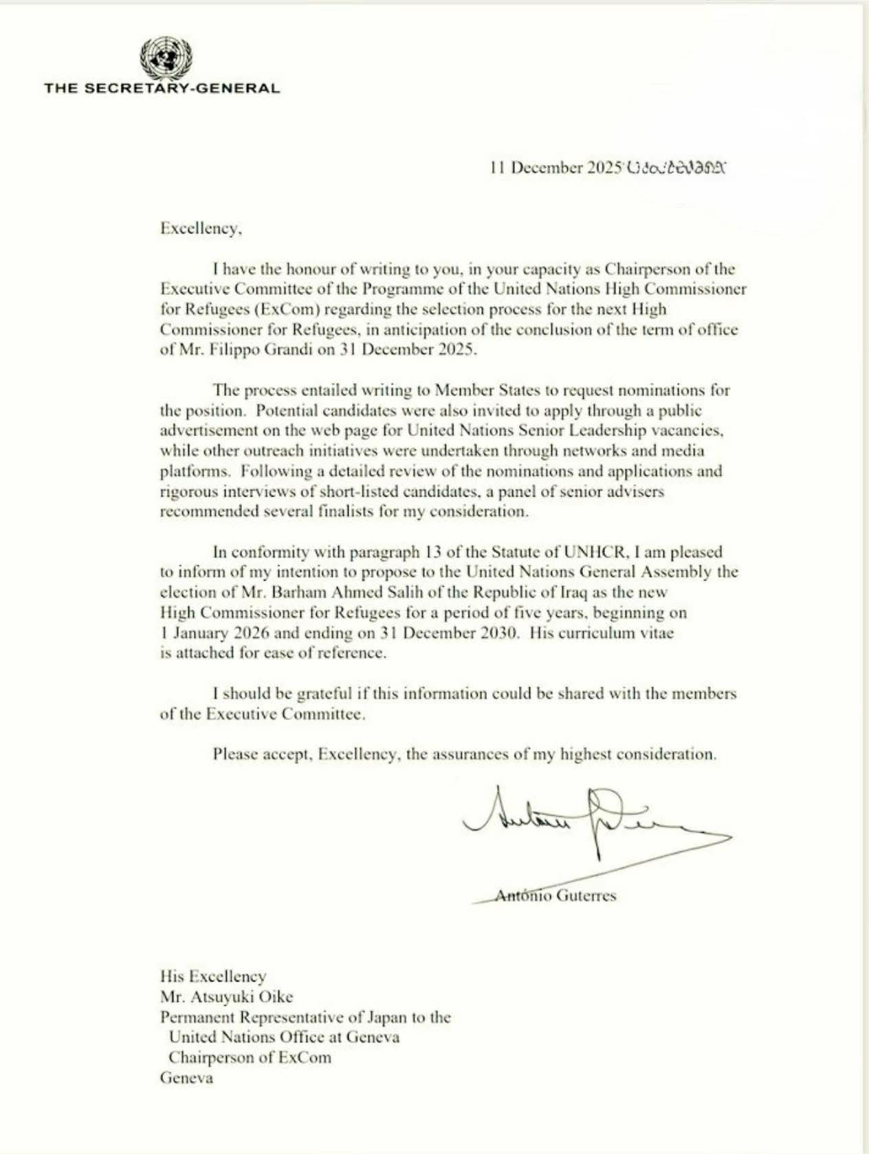 د.بەرهەم ساڵح، سەرۆك كۆماری پێشوی عێراق، پۆستی کۆمیسیاری باڵای نەتەوە یەکگرتوەکانی بۆ کاروباری پەناخوازان وەرگرت.