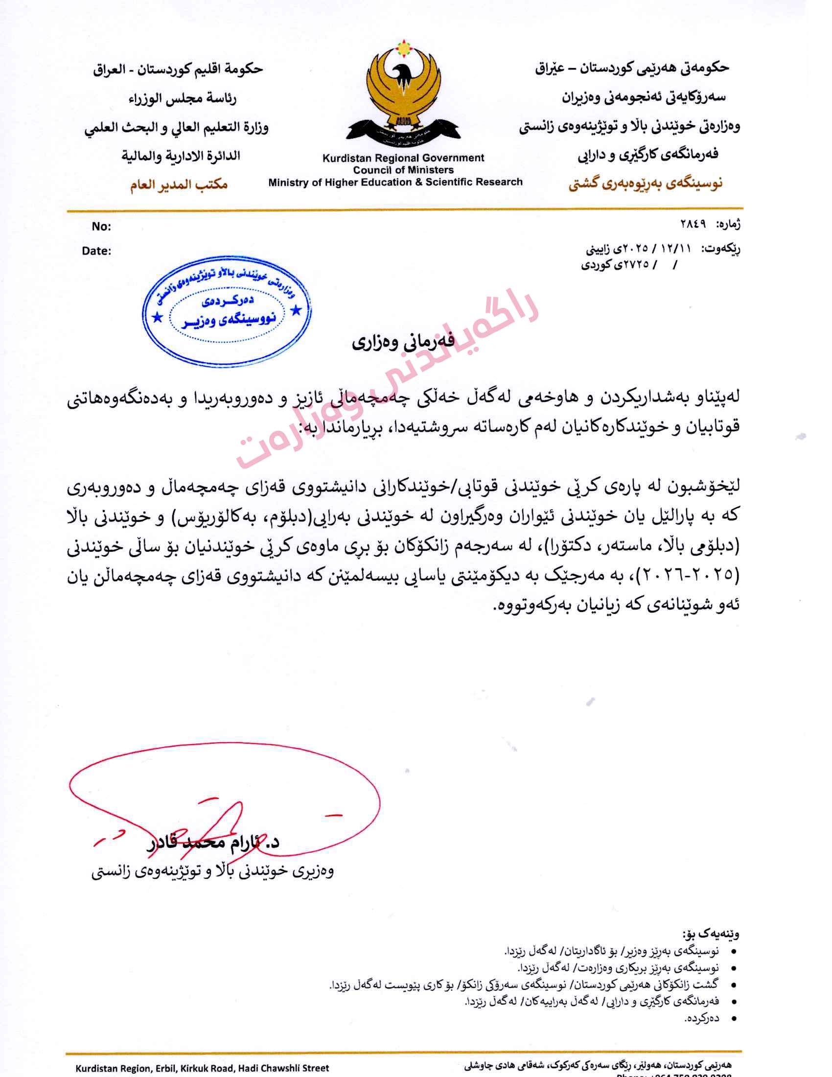 شارپرێس: وهزیری خوێندنی باڵا و توێژینهوهی زانسی ههرێمی كوردستان بڕیاریدا به لێخۆشبوون له كرێی خوێندنی بهكالۆریۆس و ماستهر و دكتۆرا بۆ خوێندكارانی چهمچهماڵ و دهوروبهری. وهزارهتی خوێندنی باڵای ههرێمی كوردستان لهڕاگهیهندراوێكدا ئاماژهی بهوهدا كه،" لهپێناو بهشداریكردن و هاوخهمی لهگهڵ خهڵكی چهمچهماڵی ئازیز و دهوروبهریداو بۆ بهدهنگهوه هاتنی قوتابیان و خوێندكارهكانیان لهم كارهساته سروشتیهدا، بهئیمزای د. ئارام محهمهد قادر وهزیری خوێندنی باڵا و توێژینهوهی زانستی بڕیاردرا به، لێخۆشبون له پارهی كرێی خوێندنی قوتابی/ خوێندكارانی دانیشتوی قهزای چهمچهماڵ و دهوروبهری كه به پارالێل یان خوێندنی ئێواران وهرگیراون له خوێندنی بهرایی (دبلۆم و بهكالۆریۆس) و خوێندنی باڵا (دبلۆمی باڵا، ماستهر، دكتۆرا)، له سهرجهم زانكۆكان بۆ بڕی ماوهی كرێی خوێندنیان بۆ ساڵی خوێندنی (2025-2026)". جهختیش لهوه كراوهتهوه كه" پێویسته خوێندكاران به دیكۆمێنتی یاسایی بیسهلمێنن كه دانیشتوی قهزای چهمچهماڵن یان ئهو شوێنانهی كه زیانیان بهركهوتووه بۆ ئهوهی بڕیاری لێخۆشبون له كرێی خوێندن بیانگرێتهوه".