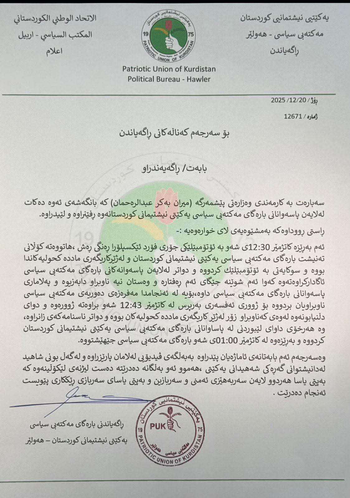 ڕاگەیاندنی مەكتەبی سیاسیی یەكێتی لەبارەی دوێنێی هەولێرەوە ڕایگەیاند، ڕاستی ئەو بابەتە بەبەڵگەی ڤیدیۆی پارێزراوەو دەشڵێت، هەموو بەڵگەكان دەدرێنە دەست لیژنەی لێكۆڵینەوەو بەپێی یاسایی سەربازی ڕێككاری پێویست ئەنجامدەدرێت.