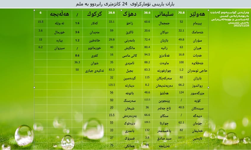 بەڕێوەبەرایەتیی گشتیی کەشناسی و بومەلەرزەزانی هەرێمی کوردستان، خشتەیەكی بڵاوكردەوە كە كۆی گشتی ڕێژەی بارانبارینی لەكاتژمێر 9ی بەیانی ڕۆژی ڕابردوو تا كاتژمێر 9ی بەیانی ئەمڕۆ تێدا تۆمار كراوە.