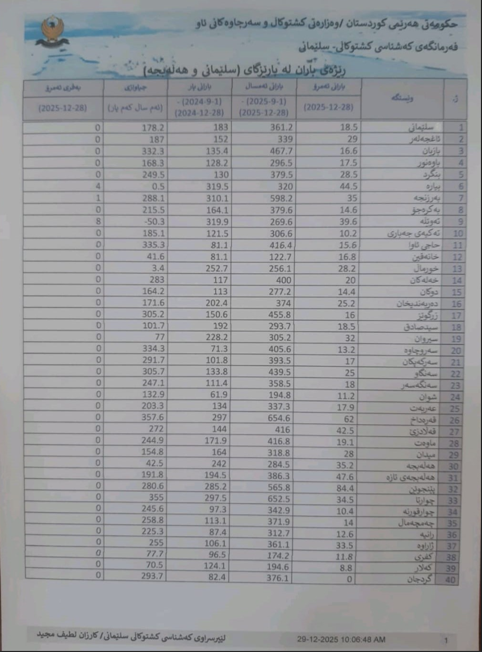 بەگوێرەی داتاکانی فەرمانگەی کەشناسیی کشتوکاڵی سلێمانی، ساڵی ڕابردوو لە1ی ئەیلولەوە كۆتای ساڵ تەنها 183 ملم باران باریبوو، بەڵام ئەمساڵ 361.2 ملم باران باریوە.