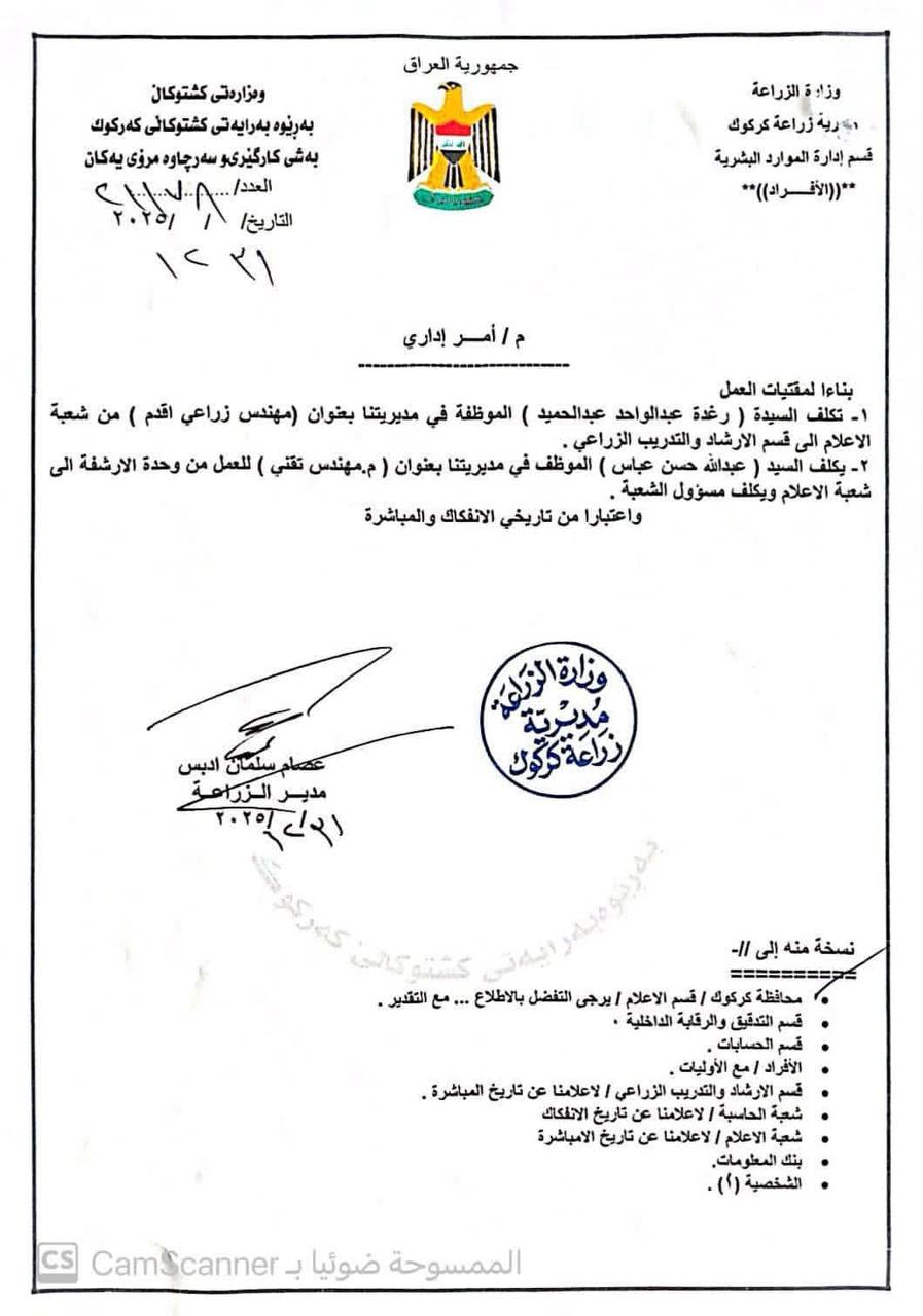 بهگوێرهى فەرمانێکی کارگێڕیی کە واژۆی عصام سهلمان ئیدریس بەڕێوەبەری نوێی کشتوکاڵی کەرکوکی لەسەرەو 21ى ئهم مانگه دهرچوه، بڕیاردراوە بەگواستنەوەی ڕەغدە عەبدولواحید عەبدولحەمید کە ئەندازیارێکی کشتوکاڵیی پێشکەوتوی کوردە لەهۆبەی ڕاگەیاندنەوە بۆ بەشی ڕێنماییو ڕاهێنانی کشتوکاڵی.