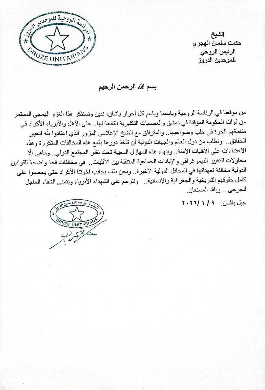 شێخ حیکمەت سەلمان هەجەری سەرۆکی سەرۆکایەتیی ڕۆحیی یەکگرتوی دروزەکان لهسوریا نوسراوێكى تایبهتى لهبارهى پهلامارهكانى سهر گهلى كورد لهسوریا بڵاوكردوهتهوهو نوسیویهتى، "ئیدانەی هێرشی داگیرکاریی هێزەکانی سوریا دەکەین بۆ سەر گهلى کورد لەشارى حەلەب، ئهوانهى پهلاماری كوردیانداوه گروپی عەسابەو تەکفیرین".