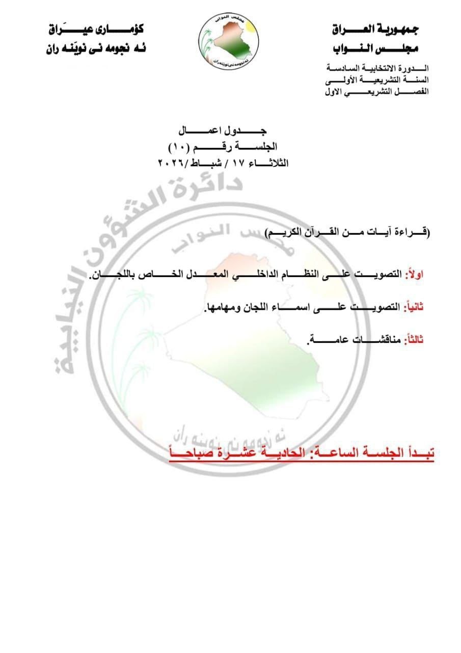 بڕیاره سبهی سێشهممه پهرلهمانی عێراق كۆببێتهوهو بهرنامهی كاری دانیشتنهكه سێ تەوەرەو ههڵبژاردنی سهرۆك كۆماری تێدا نییه.