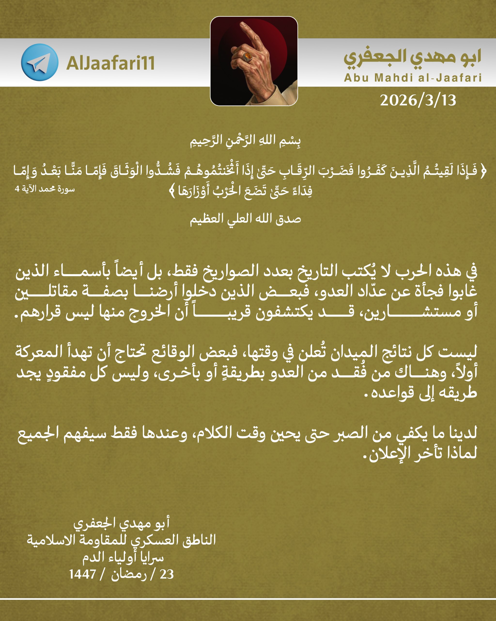 ئەبو مەهدی جەعفەری وتەبێژی سەربازیی مقاوهمهى ئیسلامى لهعێراق (سەرایا ئەولیادەم) لەپەیامێکی توندو بهپهلهدا ڕایگەیاند، "جەنگی ئەمجارە تەنها بەژمارەی موشەکەکان نانوسرێتەوە، بەڵکو بەو ناوانە دەنوسرێتەوە کە لەلیستەکانی دوژمن سڕاونەتەوە".