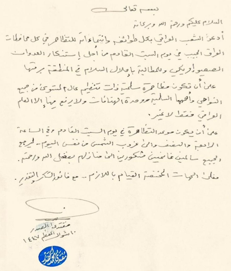 سەدر لەبهیاننامهكهیدا نوسیویهتى، "ڕۆژی شەممە خۆپیشاندانەكە لەكاتژمێر 4:30ی عەسر ئەنجامبدرێت تاكو خۆرئاوابونو دواتر هەموان بەسەلامەتی بگەڕێنەوە ماڵەكانتان".