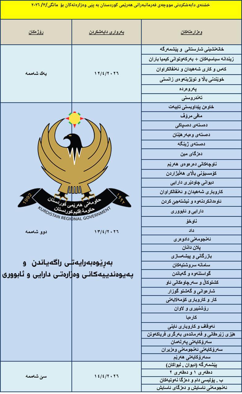وەزارەتی دارایی و ئابوری هەرێم لەڕاگەیەنراوێكدا دەڵێت،" ڕۆژی یەکشەممە ڕێکەوتی ( 12 ی نیسانی 2026 ) دەست بەدابەشکردنی موچەی مانگی ئازاری فەرمانبەران و موچەخۆرانی هەرێمی کوردستان دەکرێت و ڕۆژی سێشەممە ( 14 ی نیسانی 2026 ) کۆتایی بەدابەشکردنی موچە دێت ".