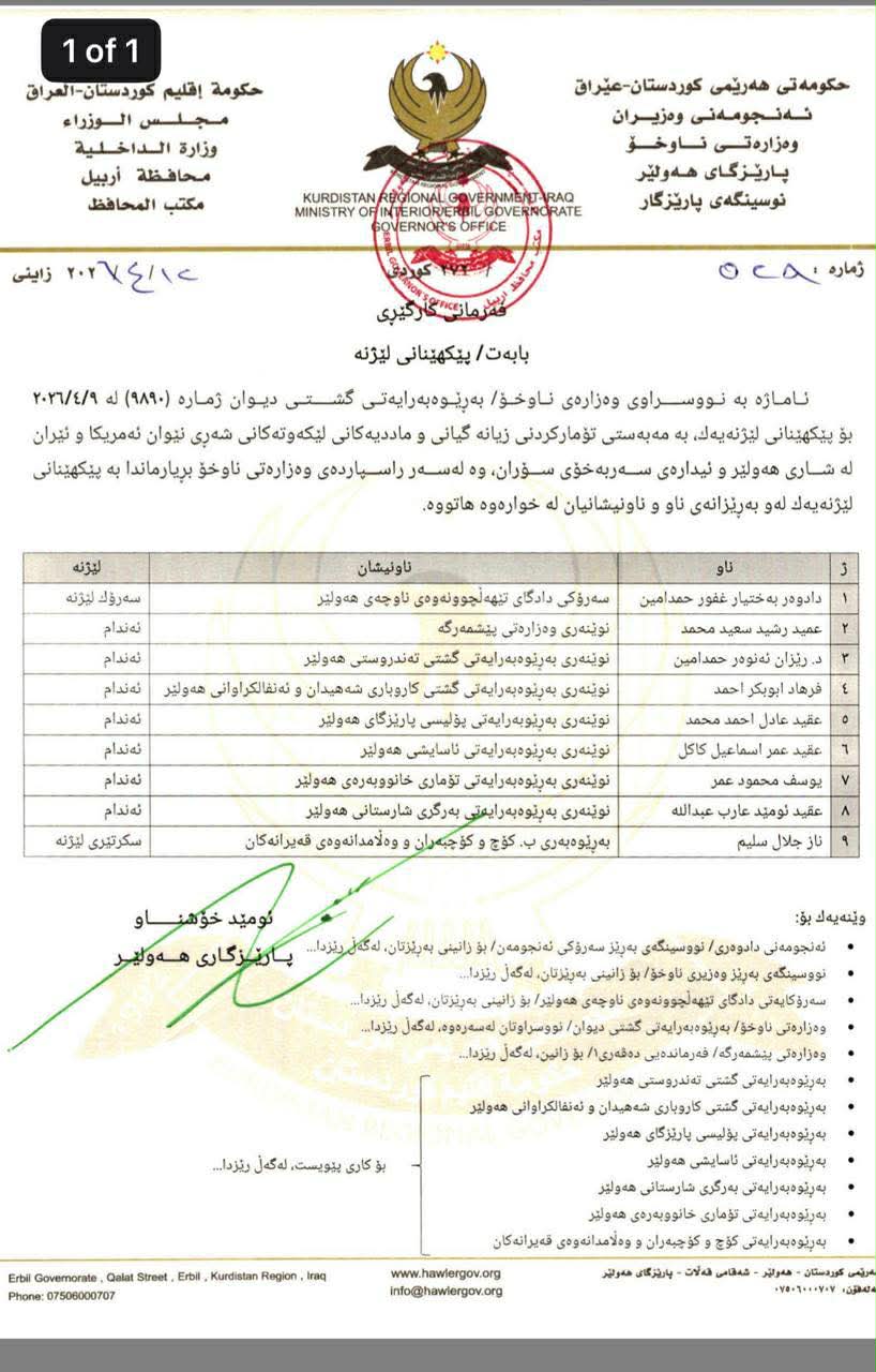 پارێزگاری هەولێر کە ئیمزای ئومێد خۆشناوی لەسەرە، لەسەر داوای وەزارەتی ناوخۆی