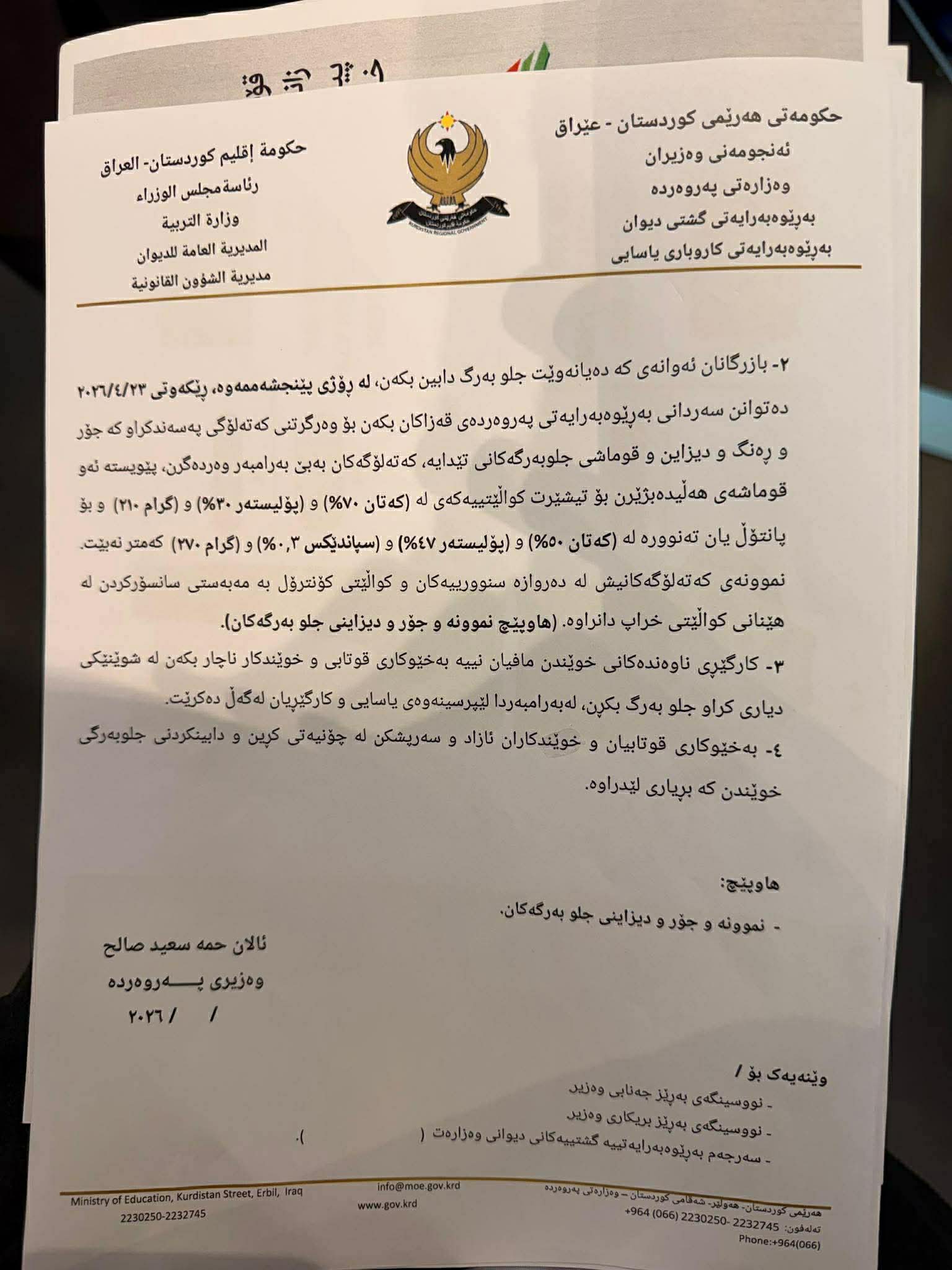 وەزارەتی پەروەردە ڕاشیگەیاندوه، کەتەلۆگی تایبەت بەشێوازو کوالێتی جلوبەرگەکان ئامادەکراوەو بازرگانان دەتوانن بەخۆڕایی لەبەڕێوەبەرایەتییە گشتییەکان وەریگرن، تاوەکو بهگوێرهى ئەو ستانداردانە جلوبەرگ بخەنە بازاڕەوەو ڕێگریی لەبارگرانی دارایی بۆسەرشانی هاوڵاتییان بکرێت.