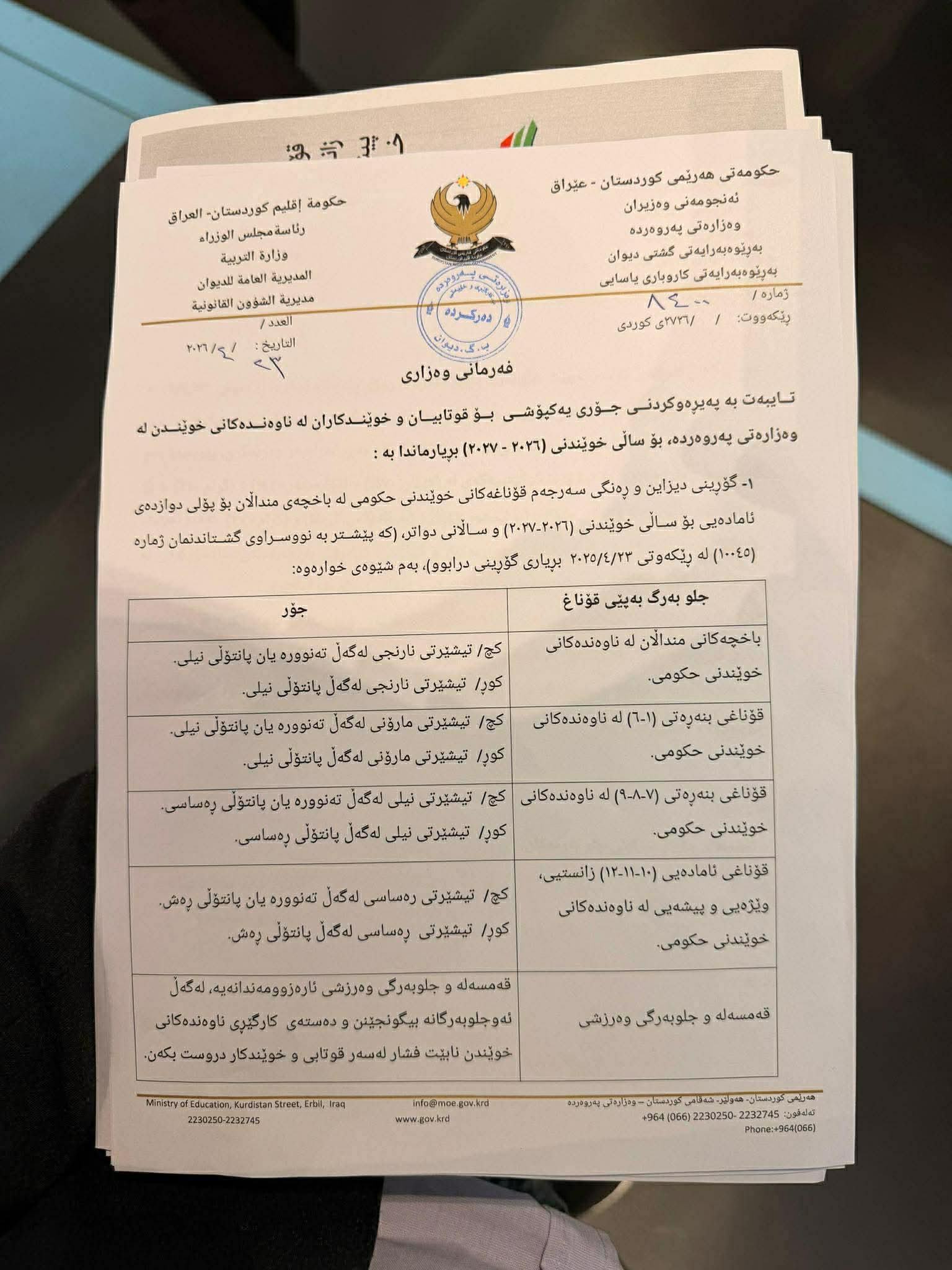 وهكو وهزیرى پهروهرده ڕایگهیاند، ساڵى داهاتوى خوێندن ڕەنگی جلوبەرگەکان بهگوێرهى قۆناغەکان بەمشێوەیە دەبێت: