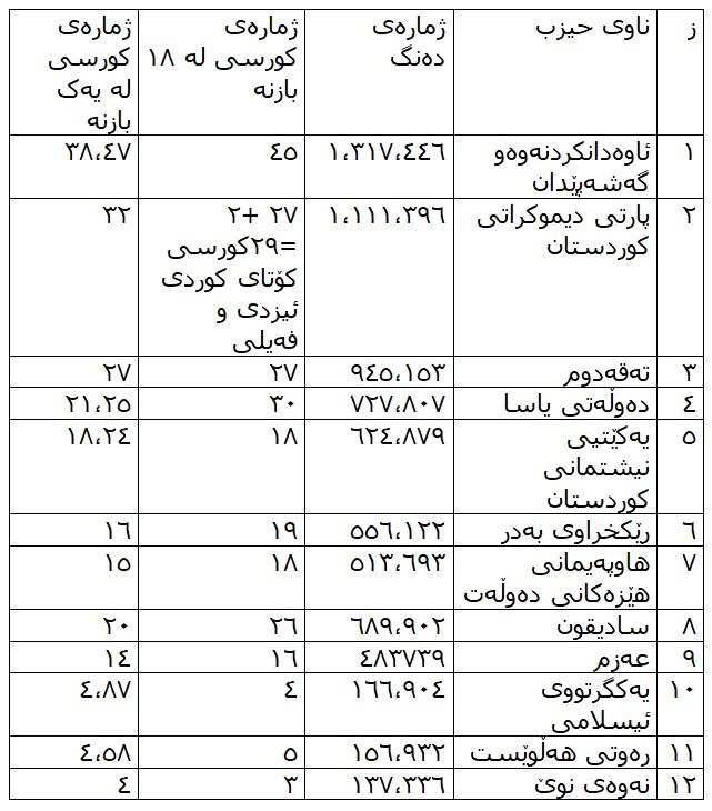 کۆمیسیۆن ژمارەی دەنگ و ژمارەی کورسی قەوارەکانی بڵاو کردەوە کە لە خشتەی خوارەوە وەک خۆی دایان دەنێن.