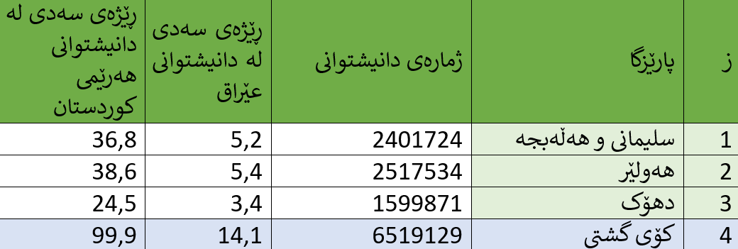 بە داتا فەرمییەکانی وەزارەتی پلان دانا، بەپێی ئەو خشتەیەی بڵاو کراوەتەوە بەشی